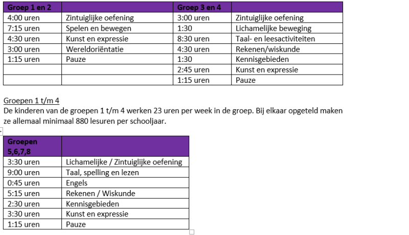 De kinderen uit deze groepen gaan langer naar school. Deze kinderen hebben een week van 26 schooluren. De kinderen uit de bovenbouw maken minimaal 1000 uren per schooljaar.